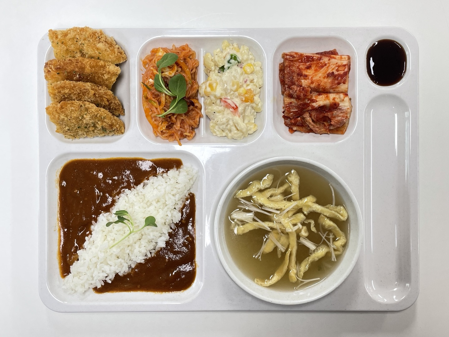[토마토카레라이스 / 유부장국 / 돈까스*소스 / 실곤약야채무침 / 후르츠마카로니샐러드 / 포기김치]