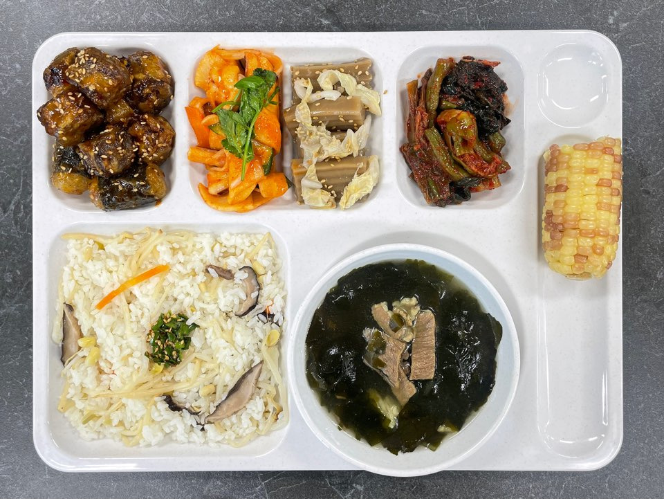 [콩나물밥*부추양념장 / 소고기미역국 / 순대김말이강정 / 오징어초무침 / 묵은지도토리묵무침 / 갓김치 / 찰옥수수]
