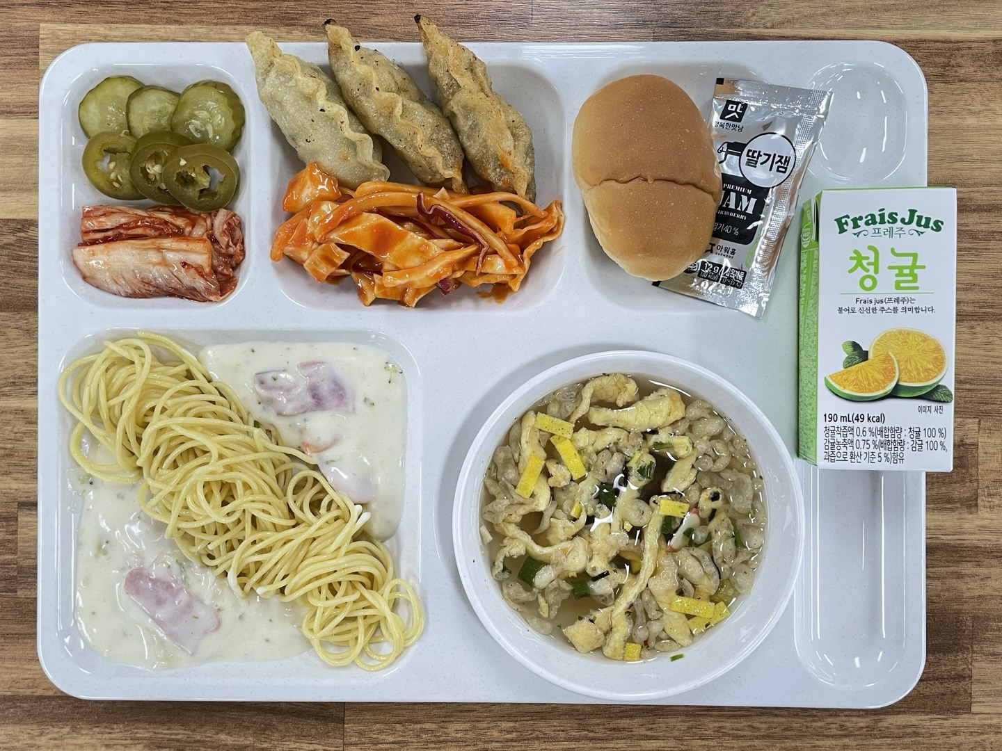 [청양까르보나라 / 유부우동국 / 비빔만두 / 모둠피클 / 모닝빵*딸기잼 / 포기김치]
