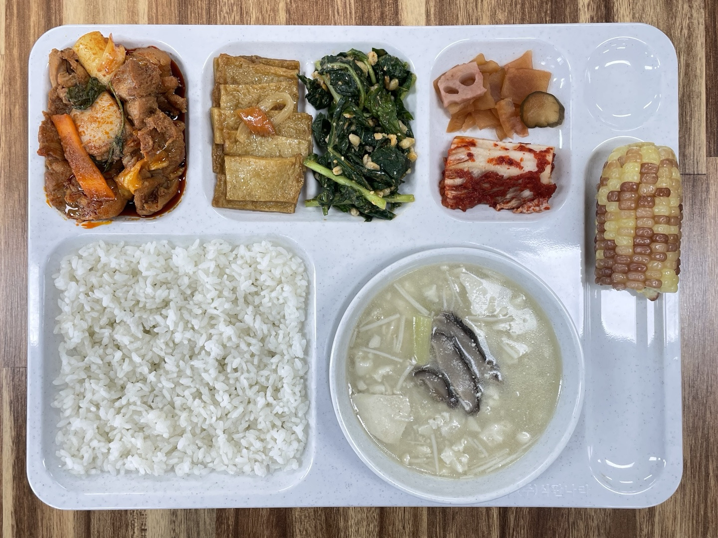 [백미밥 / 들깨순두부 / 닭갈비 / 어묵볶음 / 열무보리무침 / 오복지 / 찰옥수수 / 포기김치]