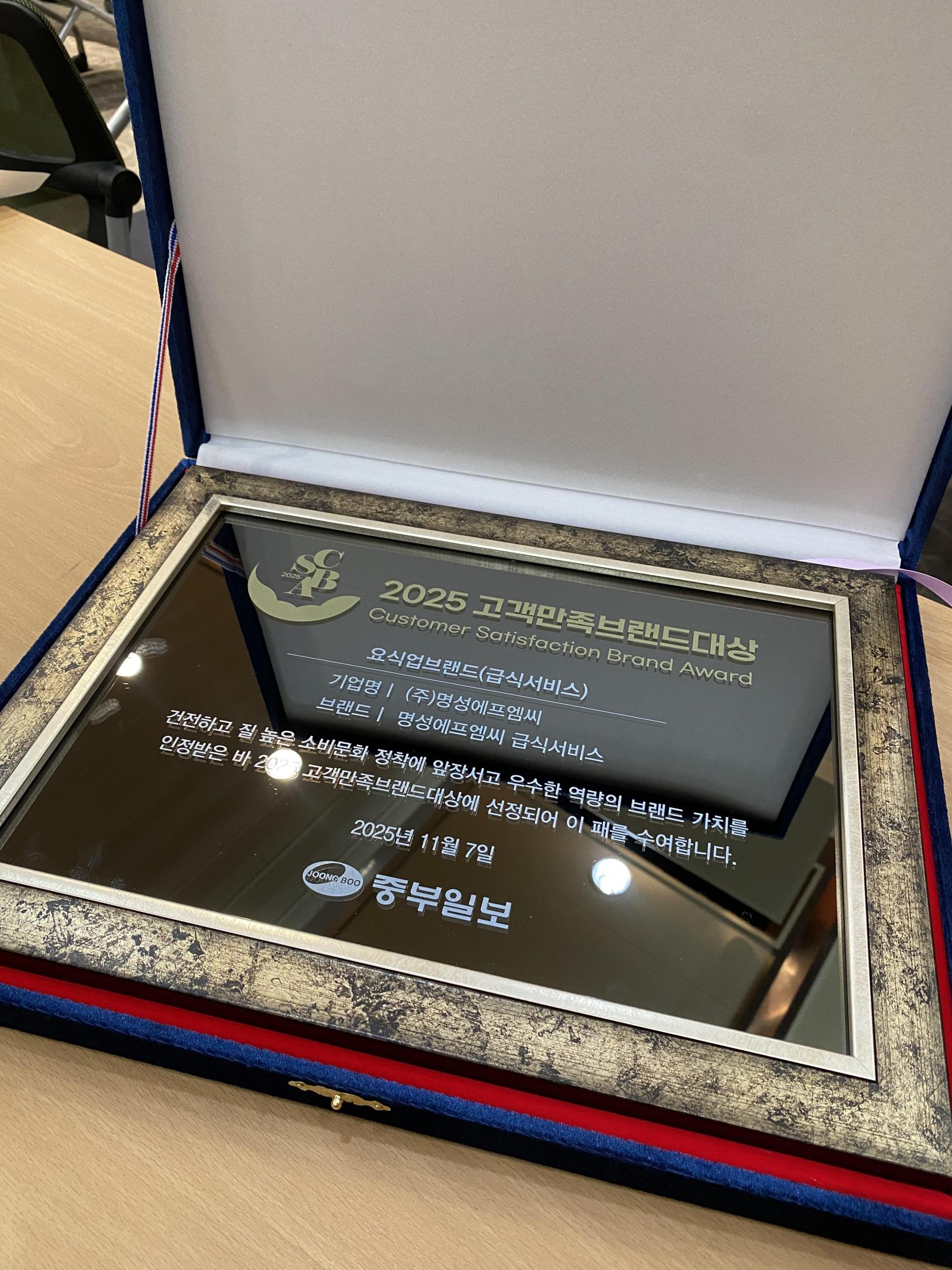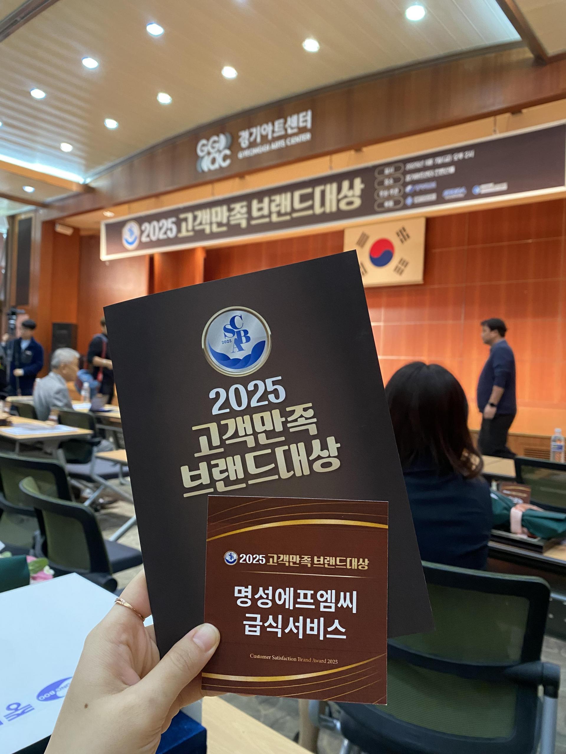 저희 명성에프엠씨가 올해 급식 서비스 부문 고객 만족 브랜드 대상을 수상하였습니다.